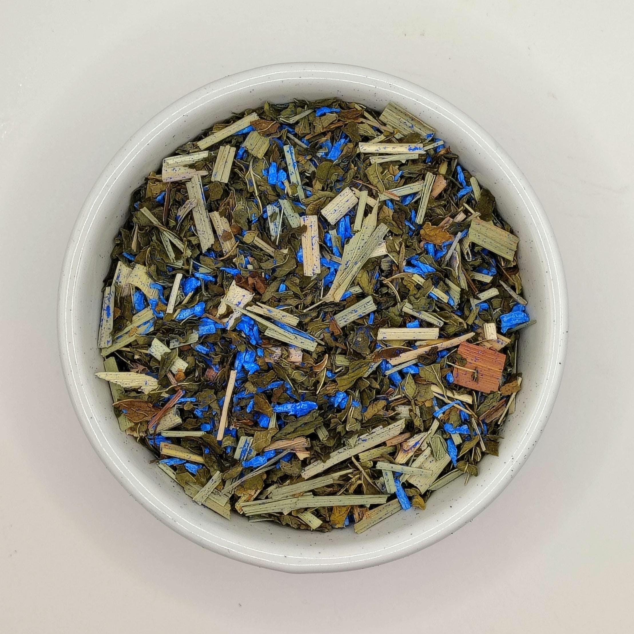 Ingredients: spearmint, lemongrass, shredded coconut, blue spirulina