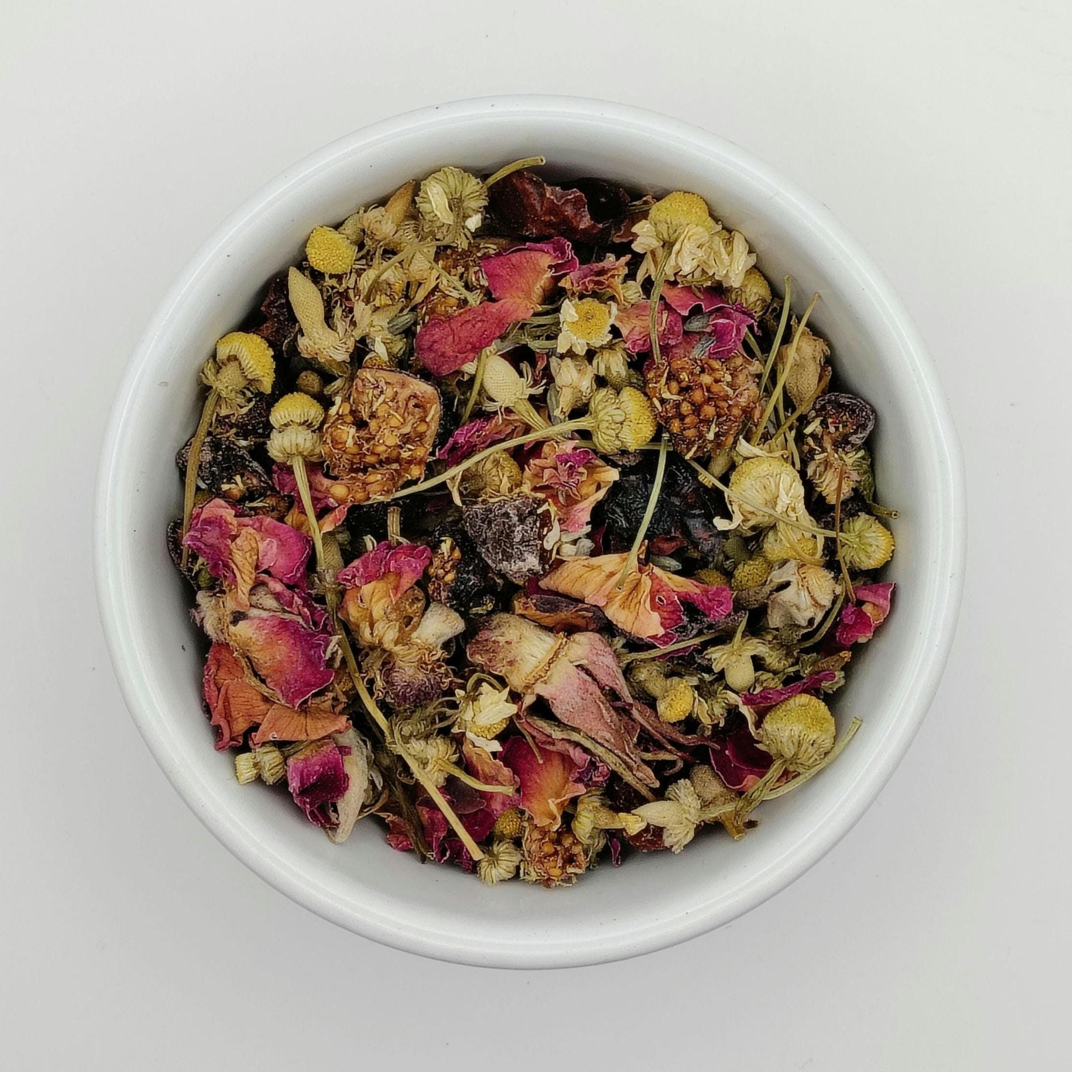 Ingredients: chamomile, rosebuds, rosehips, jasmine, lavender, dried fig